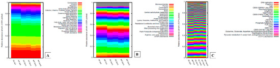 Gene functions identified from the SRS soils relative to different generations of DC/MT binned at subsystem levels 1 (A), 2 (B), and 3 (C), respectively.