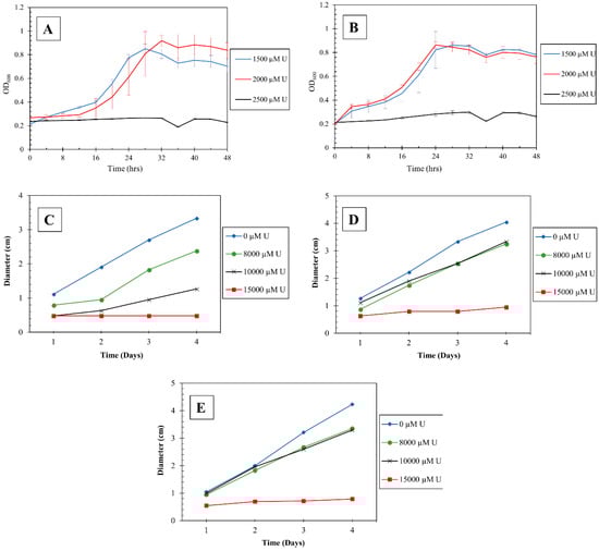 To evaluate the growth tolerance of isolated bacterial strains, they were grown in LB media amended with U ranging from 0–5 mM concentrations. As shown in Figure 5, Burkholderia spp., DC2, and DC3 grew well up to 2 mM U (to reduce clutter, only 3 U concentrations are shown on the graph). On further increase in the concentration of U to 2.5 mM, both the strains failed to grow (Figure 5A,B).