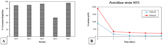 To evaluate U depletion by the isolated microbes, soil microcosms were set up at a U concentration of 1000 µM and 2000 µM. All the three fungal isolates were able to deplete approximately 90% of soluble uranium in 4 days (Figure 6A), at a 2 mM U concentration. Specifically, Penicillium sp. DC1, MT1, and MT2 were able to deplete 94%, 89%, and 91% of soluble U, respectively. Burkholderia sp. DC2 and DC3 depleted 54% and 96% U, respectively (Figure 6A). Figure 6B depicts the U present in soil microcosms for Penicillium sp. MT2 over 4 days. Within the first day, this strain depleted most of the spiked U from the soluble phase, indicating the strong potential of this fungal isolate for U bioremediation in the SRS soils.