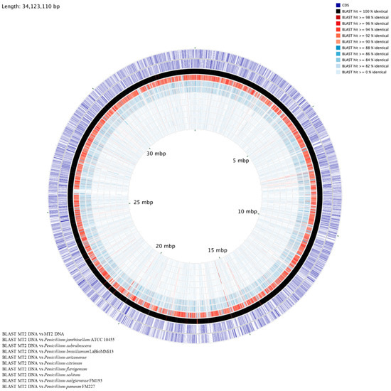 The whole genome sequence of strain MT was found to be approximately of 34,123,110 bp in size, with a G+C content of 51.15%, and consisted of a total of 11,470 genes. Strain MT2’s whole genome sequence contained an N50 length of 179,326 bases, with the longest contig length of 606,913; a circular genome map is shown in Figure 7, drawn relative to several randomly selected Penicillia. To infer taxonomic affiliation of strain MT2, a phylogenetic tree based on manually queried housekeeping genes Tsr1, Cct8, RPB1, and RPB2A, from the genome sequence of strain MT, is shown in Figure 8A. A similar approach was recently used to characterize a novel Penicillium spp., isolated from an extremely metal-rich mining site in Russia [82]. This analysis revealed the closest affiliation of strain MT2 with Penicillium janthinellum strain NCIMI366. Further iteration of the evolutionary relatedness of MT2 genome-wide comparisons were run with a cohort of 28 other Penicillium genomes, which confirmed that the closest taxonomic affiliation of MT2 was with P. janthinellum, followed by P. decumbens strain IBT, P. oxalicum, and P. subrubescens, respectively (Figure 8B). Based on these analyses, it appears that MT2 is a potentially new species related to P. janthinellum.