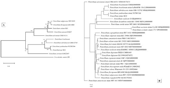 Shown is a phylogenetic tree constructed with maximum likelihood using concatenate sequences of the housekeeping genes Tsr1, Cct8, RPB1, and RPB2 (A), and (B), a genome-wide phylogenetic tree constructed with a cohort of 28 other sequenced Penicillium species available via the NCBI genome submission portal.