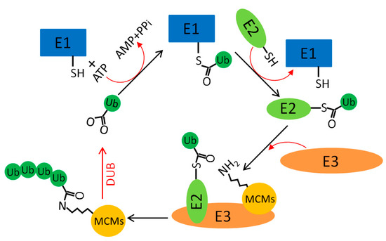 The ubiquitination system is involved in various cellular processes, such as protein stability, cell-cycle progression, DNA replication, and cellular metabolism [100,101,102]. Ubiquitin is a small peptide (8.6 kDa) that can covalently conjugate with a lysine residue of a substrate protein through three enzymatic steps: activation by ubiquitin-activating enzymes (E1s), conjugation by ubiquitin-conjugating enzymes (E2s), and ligation by ubiquitin ligases (E3s). Ubiquitination can be monomeric or polymeric (Figure 2) [103]. Linkage type through different lysine residues in ubiquitin (Lys-6, Lys-11, Lys-27, Lys-29, Lys-33, Lys-48, Lys-63) and the first methionine defines different poly-ubiquitination chains and function. All the human MCM proteins are ubiquitylated in human cells [104,105,106], and the ubiquitination status of some MCM proteins changes upon DNA damage and replication stress [78] (Table 4). This finding suggests that MCM ubiquitination may have an important role in regulating replication progression and genome stability.