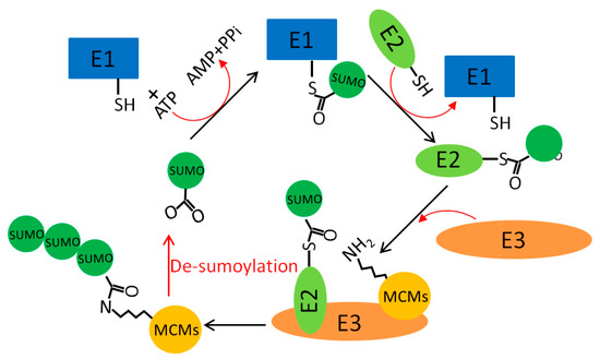 The small ubiquitin-like modifier (SUMO) protein belongs to the ubiquitin-like protein family. SUMOs are covalently attached to or detached from substrates, regulating various cellular processes [134]. In human cells, SUMOs have four isoforms: SUMO-1, SUMO-2, SUMO-3, and SUMO-4. The SUMO precursor undergoes cleavage by the Sentrin-specific protease (SENP) to remove extra C-terminal amino acids before it becomes mature. Like ubiquitination, sumoylation needs three enzymatic steps (E1 activation, E2 conjugation, E3 ligation) to covalently add SUMO moieties onto a substrate (Figure 4) [135]. MCM sumoylation is highly conserved across different species [136,137,138].