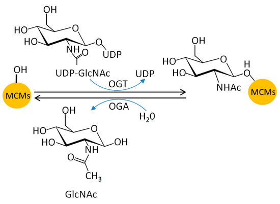 O-GlcNAcylation (O-linked β-N-acetylglucosaminylation) is catalyzed by O-GlcNAc transferase (OGT) (Figure 5) and is a rapid responsive modification to nutrient deprivation and cellular stress. It regulates multiple cellular events, such as chromatin remodeling and cell division [142,143,144,145].