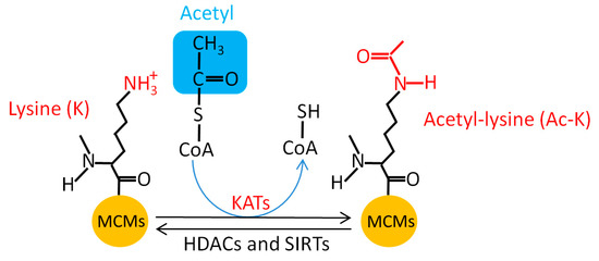 Protein acetylation covalently introduces an acetyl functional group into a substrate (Figure 6) and modulates varieties of cellular activities through acetylation of histones and non-histone proteins [151]. Several studies revealed that MCM proteins are substrates for acetylation (Table 7) [152,153,154]. Takei et al. identified MCM3-associated protein (MCM3AP) as an acetyltransferase for chromatin-bound MCM3 acetylation that inhibits the initiation of DNA replication [155]. Fatoba et al. found that the p300 histone acetyltransferase (HAT) acetylates MCM10 in both the DNA binding domain internal domain (ID) and the C-terminal domain (CTD) [156], but its acetylation elicits different biological functions in vivo; acetylation in the ID promotes MCM10 DNA binding, while acetylation in the CTD suppresses DNA binding. Meanwhile, some of the acetylation sites (Table 7) can be directly deacetylated by the nicotinamide adenine dinucleotide (NAD)-dependent protein deacetylase sirtuin-1 (SIRT1) [156]. SIRT1 depletion promotes MCM10 chromatin loading and retention during S phase and increases the replication speed. Simultaneous depletion of SIRT1 and MCM10 slows down the replication speed and fired origin distance, which suggests that MCM10 and SIRT1 synergistically modulate DNA replication progress [156]. These findings suggest that MCM protein acetylation has an important role in replication.
