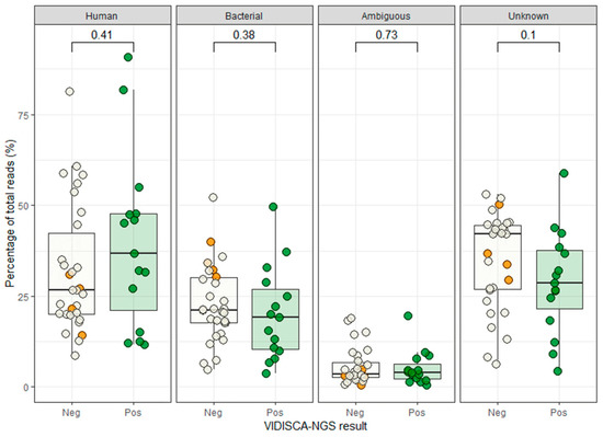 Background sequences in VIDISCA-NGS. Green dots: samples that were positive by VIDISCA-NGS, white dots: samples that were negative by VIDISCA-NGS, orange dots: the four samples containing an RNA virus not found by VIDISCA-NGS. On top the p-values are shown for the Mann-Whitney U test between the positive and negative VIDISCA-NGS samples. “Human” indicates human mitochondrial or genomic background, “Bacterial” indicates prokaryotic background, “Ambiguous” represents sequences with simultaneous hits to eukaryotes and prokaryotes, and “Unknown” are the sequences that do not match with any reference sequence.