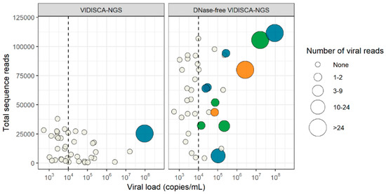 Detection of herpesviruses by VIDISCA-NGS in CSF. The results of regular VIDISCA-NGS are in the left panel, results of DNase-free VIDICSA-NGS are in the right panel. If a sample contained multiple viruses, multiple data points are displayed for each of the co-infecting viruses. A vertical line is drawn to separate samples above and below 104 DNA copies/mL. Green dots: samples that were positive by VIDISCA-NGS for HSV-1/2, blue dots: samples that were positive by VIDISCA-NGS for VZV, orange dots: samples that were positive by VIDISCA-NGS for CMV, white dots: samples that were negative by VIDISCA-NGS. The size of the dots corresponds to the number of viral reads. On the x-axis, the viral load in CSF is displayed; on the y-axis, the total number of sequence reads.
