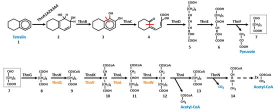 - Lopez-Sanchez, A.; Floriano, B.; Andujar, E.; Hernaez, M.J.; Santero, E. Tetralin-induced and ThnR-regulated aldehyde dehydrogenase and beta-oxidation genes in Sphingomonas macrogolitabida strain TFA. Appl. Environ. Microbiol. 2010, 76, 110–118. [Google Scholar] [CrossRef] [PubMed]