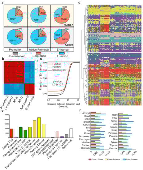 However, the analysis results of the same comparison of enhancers in pigs, humans, and cattle were very different. More than 87% of pig enhancers were sequence conserved with humans or cattle. However, only 30% and 31.7% of pig enhancers played enhancer roles in humans or cattle, respectively, which were extremely low. These results indicated that a large number of pig enhancers are sequence conserved, but few are functionally conserved in liver tissue of other species (Figure 2a,b).
