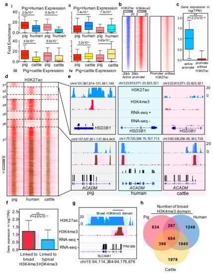 The promoter with H3K27ac is associated with high gene expression levels in humans and mice and is defined as an active promoter [41]. We explored whether this state also exists in pigs, and we determined the feature and regulation function of active promoters among pigs, humans, and cattle. First, we divided 9,499 H3K4me3 binding promoters without H3K27ac signal from the total number of promoters (Figure 3b). Integrated analysis between gene expression and chromatin states indicated that the active promoter-associated genes are generally expressed at higher levels than genes associated with promoters without H3K27ac signal in pigs (p-value < 2.21 × 10−16 (Figure 3c), as promoter states drive cell development and differentiation [4,14,39]. We next compared the promoter states in three species according to one-to-one homologous genes to explore the similarity of active promoter states among pigs, humans, and cattle (Figure 3d). The results implied three major categories: (i) homologous genes with conserved promoter status, (ii) homologous genes with species-specific active promoter states, and (iii) homologous genes with species-specific promoter with no H3K27ac signal (Figure 3d, Supplementary Materials Table S10). One typical example is HSD3B1, which is associated with boar taint and is highly expressed in pig liver tissue [42,43]. In our study, this gene was only expressed in pig liver tissue with species-specific active promoters. Another example is ACADM, which is involved in liver lipid metabolism and fatty acid oxidation in mammals [44,45]. In the present study, we confirmed this gene with a stable active promoter in liver tissue across pigs, humans, and cattle.