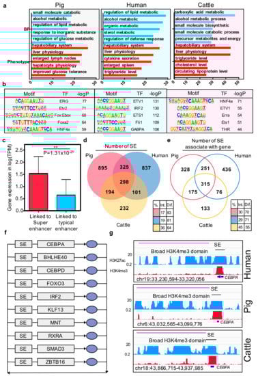 Characteristics of super and typical elements in three mammals. (a) Enriched Gene Ontology terms and phenotype terms for the top 3000 enhancers ranked by H3K27ac intensity in pigs, humans, and cows. The y-axis represents the –log p-value; (b) Enriched TF binding motifs with associated p-values for top 3000 enhancers in pigs, humans, and cows; (c) The bar plot of the gene expression (log TPM) at the linked genes of super-enhancer and typical enhancer. * p-value = 4.81 × 10−17 (Wilcoxon rank-sum test). (d) Venn diagram showing the number of functional conserved super-enhancers across pigs, humans, and cows. (e) Venn diagram showing the number of orthologous genes associated with super-enhancers in pigs, humans, and cows. Color-coded tables show the percentages of intersection and difference for each species. The observed differences in intersection between super-enhancer elements and super-enhancer associated with genes in the three species are significant (p-values = 1.66 × 10−16) based on G-tests of independence. (f) Overlapping transcriptional core regulatory circuitry (CRC) cross liver tissues of three species. The grey rectangles represent super-enhancers (SEs) and genes, and the blue oval symbols represent the proteins. (g) ChIP-seq, H3K4me3, and H3K27ac profiles of representative conserved broad H3K4me3 domain and super-enhancer located in one of the transcriptional core regulatory circuitry transcription factor CEBPA region in the three species.
