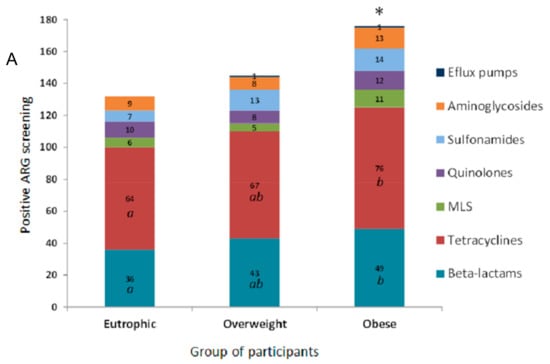 Distribution of antimicrobial resistance genetic markers (ARG) related to different classes of antimicrobial drugs accordingly to positive screening by PCR of the faecal metagenome from eutrophic, overweight, and obese individuals. (A) ARG were clustered based on their chemical structure or phenotype, such as β-lactams, tetracyclines, macrolide lincosamide and streptogramin group (MLS), quinolones, sulfonamides and aminoglycosides, and efflux pumps. For the obese, overweight and eutrophic groups, ARG screening was positive in 176, 145 and 132 tests, respectively. Captions a, b, and * indicate statistically significance (p < 0.05). (B) Absolute distribution (number of positive screenings) of 27 positive ARG out of 55 tested genetic markers in intestinal metagenomes from eutrophic, overweight and obese individuals. β-lactams (ampC, blaCTX-M, blaTEM, blaSHV, blaOXA-2, blaOXA-143, cfiA, cepA, blaZ, mef); tetracyclines (tet(A), tet(B), tet(E), tet(L), tet(M), tet(O), tet(Q)); macrolides, lincosamide and streptogramin group (MLS) (mphA, ereA, ereB, vgb); quinolones (qnrB, qnrS); sulfonamides (sul1, sul2); aminoglycosides (aacA-aphD); and efflux pumps (mexY).