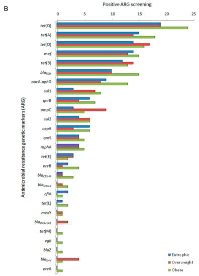 In this study, the evaluated clinical resistome comprised the screening of 55 ARG. The ARG were representative of antimicrobials commonly used in both human and veterinary medicine. ARG screening was positive for 27 genetic markers related to different classes of antimicrobial drugs based on their chemical structure, such as β-lactams, tetracyclines, the macrolide lincosamide and streptogramin group (MLS), quinolones, sulfonamides, and aminoglycosides. The efflux pump related to mexY, was also detected (Figure 1A). The clinical resistome representative of the gastrointestinal tract was significantly different between the three groups of individuals, especially considering the detection rates of ARG in the obese group. Genetic markers related to tetracycline resistance were the most frequently observed in all groups, followed by β-lactams, aminoglycosides, sulfonamides and quinolones. In general, ARG were detected at higher frequencies among obese individuals (Figure 1B).