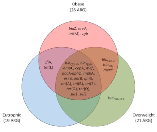 Venn diagram representative of the antimicrobial resistance genetic markers (ARG) occurrence and qualitative clustering according to their positive screening exclusively or shared between eutrophic, overweight, and obese individuals. β-lactams (ampC, blaCTX-M, blaTEM, blaSHV, blaOXA-2, blaOXA-143, cfiA, cepA, blaZ, mef); tetracyclines (tet(A), tet(B), tet(E), tet(L), tet(M), tet(O), tet(Q)); macrolides, lincosamide and streptogramin group (MLS) (mphA,, ereA, ereB, vgb); quinolones (qnrB, qnrS); sulfonamides (sul1, sul2); aminoglycosides (aacA-aphD); and efflux pumps (mexY).