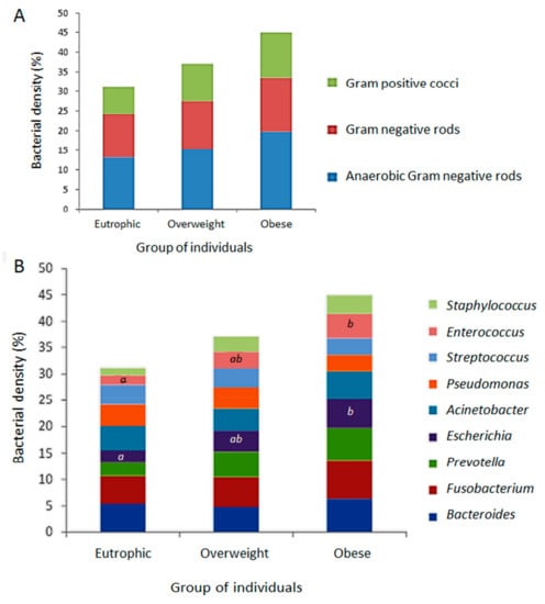 Relative density of the bacterial groups associated to the positive screening of antimicrobial resistance genetic markers (ARG), determined by fluorescence in situ hybridization (FISH) from the faecal metagenomes of eutrophic, overweight and obese individuals. (A) Quantitative evaluation by clustering different bacterial groups according to the hybridization probes available and relevance of microorganisms: anaerobic Gram-negative rods (Fusobacterium spp., Prevotellaspp., Bacteroides spp.); Gram-negative rods (E. coli, Acinetobacter spp., Pseudomonas spp.); Gram-positive cocci (Staphylococcus spp., Enterococcus spp., Streptococcus spp.). (B) Distribution of evaluated bacterial groups among eutrophic overweight and obese individuals. Captions a, b, and * indicate statistically significant results (p < 0.05).
