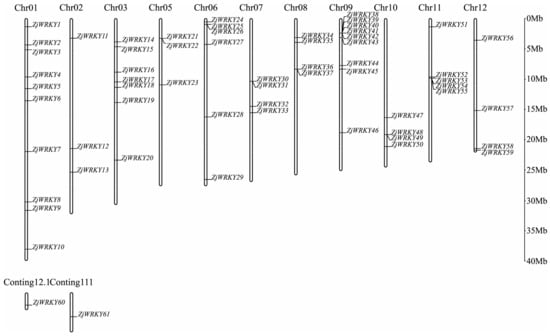 In this study, a total of 61 potential ZjWRKY genes were identified through genome-wide analysis and designated according to their chromosomal location of ‘Junzao’ jujube genome (Table 1). All 61 predicted genes containing WRKY domains were confirmed. The length of these 61 proteins varied from 158 (ZjWRKY60) to 758 (ZjWRKY4) amino acids. The predicted MWs ranged from 18 kDa to 82 kDa, and the pIs varied from 5.16 (ZjWRKY52) to 9.53 (ZjWRKY59). Among these 61 ZjWRKY genes, 59 were located on the 11 jujube chromosomes, and chromosome 4 did not contain any ZjWRKY gene. 10 ZjWRKY genes were mapped on chromosome 1, which contained the most ZjWRKY genes. Chromosomes 2 and 5 each contained only 3 ZjWRKY genes (Figure 1).