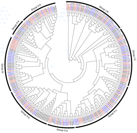 Phylogenetic analysis of the WRKY proteins from Ziziphus jujuba ‘Junzao’ jujube, Arabidopsis thaliana and Solanum lycopersicum. Multiple sequence alignments of WRKY amino acid sequences were performed using ClustalW. The phylogenetic tree was constructed using MEGA7.0 with the neighbor-joining method and 1000 bootstrap replicates (substitution model: Jones–Taylor–Thornton model). Group (I, II, III) and subgroup (IIa~IIe) names were marked outside the circle.