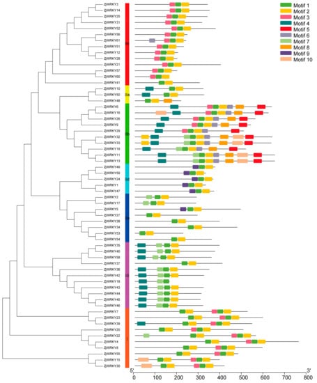 Phylogenetic tree and motif composition of ‘Junzao’ WRKY proteins. The phylogenetic tree was constructed using MEGA7.0 with the neighbor-joining method and 1000 bootstrap replicates (substitution model: Jones–Taylor–Thornton model). Multiple Em for Motif Elicitation (MEME) was used to predict motifs. Ten motifs were identified and were represented by different colors. The position of the motif on the chromosome was labeled.
