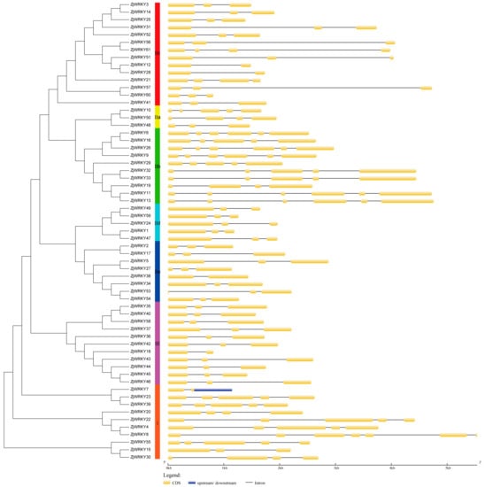 Intron-exon structure of ZjWRKY genes of Ziziphus jujuba ‘Junzao’. The phylogenetic tree was constructed using MEGA7.0 with the neighbor-joining method and 1000 bootstrap replicates (substitution model: Jones–Taylor–Thornton model). Analysis of ZjWRKY genes structure using gene structure display server (GSDS). Yellow blocks indicate the coding sequences (CDS), blue blocks indicate upstream or downstream sequences, and black lines indicate introns.