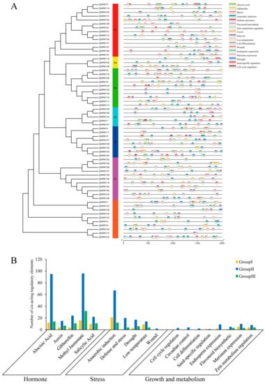 These cis-acting regulatory elements in the ‘Junzao’ ZjWRKY genes promoter regions were mainly classified into four categories: light-responsive elements, hormone-responsive elements, stress-responsive elements, and growth and metabolic-responsive elements (Figure 5a,b). The light-responsive elements were present in the promoter regions of all ZjWRKY, and included Box 4, G-box, and GT1-motif. Hormone-responsive elements included response elements to ABA (ABRE), auxin (AuxRR-core, and TGA-box), gibberellin (GARE-motif, P-box, and TATC-box), methyl jasmonate (CGTCA-motif, and TGACG-motif), and salicylic acid (TCA-element), among which the methyl jasmonate (MeJA)-responsive elements were the most dominant, accounting for 37.36% of the hormone-responsive elements. The stress-responsive elements included response elements to anaerobic induction (ARE), defense and stress (TC-rich repeats), drought (MBS), low temperature (LTR) and wound (WUN-motif). Among these, response elements to anaerobic induction were the most abundant, accounting for 55.00% of stress-responsive elements. We found hormone-responsive and stress-responsive elements present in the promoter region of some ZjWRKY genes in each of the three groups. Growth and metabolic-responsive elements mainly include: elements associated with Zein-metabolism regulation (O2-site), meristem expression (CAT-box), and endosperm expression (GCN4_motif). In addition, we found the W-box element in the promoter regions of the 43 ZjWRKY genes (Table S3). Similar to the ‘Junzao’ jujube, the light-responsive elements were observed in the promoter region of all ‘Dongzao’ jujube WRKY genes. Unlike the ‘Junzao’ jujube, the ABA-responsive elements were the most dominant among the hormone-responsive elements, and cis-acting regulatory element involved in zein metabolism regulation was the most dominant among the growth and metabolic-responsive elements (Figure S1e,f).
