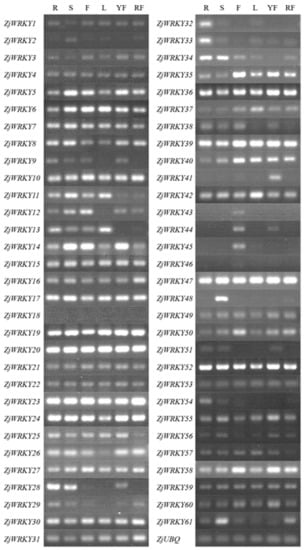 2.5. Tissue-Specific Expression Analysis of ZjWRKY Genes by Reverse Transcription Polymerase Chain Reaction (RT-PCR)