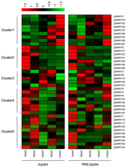 Wild jujube is the wild type of jujube and genetically close to jujube, so their WRKY TFs might be similar with high possibility. On the other hand, wild jujube fruit is smaller and more acidic than jujube []. In order to identify ZjWRKY genes that might involve in fruit enlargement and sugar accumulation, we detected the expression level of ZjWRKY genes during the fruits development of wild and cultivated jujube. Based on the transcriptomic analysis, in total, there were 39 and 44 ZjWRKY genes with RPKM value ≥ 1 during fruit development and ripening of ‘Junzao’ jujube and ‘Qingjiansuanzao’ wild jujube, respectively. These 39 genes expressed in ‘Junzao’ fruit were divided into 5 clusters based on their expression level (Figure 7). In cluster 1 (9 genes), the expression level increased gradually. In cluster 2 (7 genes), the expression level decreased gradually. In cluster 3 (5 genes), the expression level increased first and then decreased, whereas in cluster 4 (8 genes), the expression level decreased first and then increased. In cluster 5 (10 genes), expression level was variable.