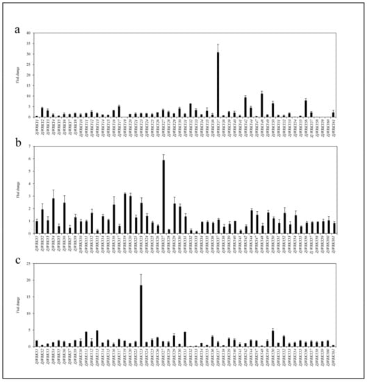 ZjWRKY genes expression in wild jujube seedlings under three different treatments. (a) Expression level of ZjWRKY genes under drought stress; (b) Expression level of ZjWRKY genes under NaCl stress; (c) Expression level of ZjWRKY genes under ABA treatment. The histograms represent the fold changes of expression level compared to the reference. The error bars represent standard deviation. ZjWRKY genes expression level were determined by real-time quantitative polymerase chain reaction (RT-qPCR) using ZjUBQ as a positive reference.