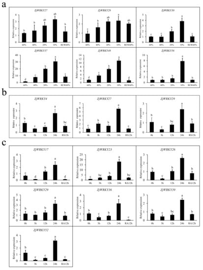Expression profile of the ZjWRKY genes under three treatments. (a) Expression level of 6 ZjWRKY genes in soil moisture content 60%, 40%, 20%, 10%, and 60% after re-watering (REW60%); (b) Expression level of 3 ZjWRKY genes under 0 h, 3 h, 12 h, and 24 h NaCl treatment, and 12 h removal of NaCl (RS 12 h); (c) Expression level of 7 ZjWRKY genes after 0 h, 3 h, 12 h, and 24 h of ABA treatment, and 12 h after removal of ABA (RA 12 h). The histograms represent the relative expression level of ZjWRKY genes compared to the reference. Error bars represent standard deviations. The data were calculated using the method of 2-ΔΔCt. LSD detection was used to label different letters when there was a significant difference in expression (p < 0.05; n = 3).