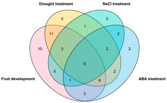 The Venn diagram of ZjWRKY genes related to fruit development, drought, NaCl, and ABA treatment.