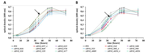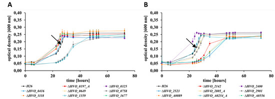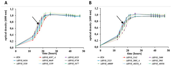 Growth curves of the parent strain H26 (black) and 16 deletion mutants (in color) grown in a complex medium. (A) Parent strain H26 (black) and the deletion mutants ∆0197_A (red), ∆0325 (purple), ∆0416 (dark blue), ∆0649 (yellow), ∆0758 (grey), ∆1118 (dark green), ∆1359 (light blue), ∆1677 (light green). (B) Parent strain H26 (black) and the deletion mutants ∆2142 (red), ∆2400 (purple), ∆2523 (dark blue), ∆2805_A (yellow), ∆2901 (grey), ∆A0089 (dark green), ∆A0254_A (light blue), ∆A0556 (light green). The wild-type is indicated by black arrows.