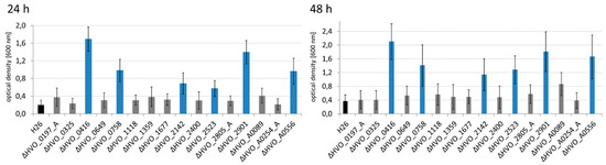 Comparison of the biofilm formation of the parent strain H26 (black) and its 16 deletion mutants after 24 h and 48 h incubation. The mutants with a gain of function phenotypes are shown in blue. Average values of three biological replicates and their standard deviations are shown.