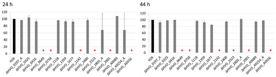 Comparison of the swarming velocity of the parent strain H26 (black) and its 16 deletion mutants after 24 h and 44 h incubation. Average values of three biological replicates and their standard deviations are shown. At both time points, the swarming diameters of the mutants were normalized to that of the parent strain H26 (= 100%). The wild-type had a swarming diameter of 5 mm after 24 h and 23 mm after 48 h. The cultures were injected into the semi-solid agar using a tip with 1 mm diameter. Colonies with no observable swarming with a colony diameter of less than 2 mm after 44 h were regarded to have a null phenotype. The mutants with a null phenotype are indicated by red asterisks.