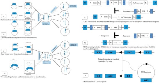 Mechanism of the three approaches for the removal of selectable marker genes from transgenic plants []. (a) The mechanism of co-transformation to removal of selectable marker genes from transgenic plants. a1, Mixture method of Agrobacterium co-transformation. a2, One-strain method of Agrobacterium co-transformation. a3, Super binary vector for co-transformation. a4, Two pairs of right borders and left borders used for co-transformation; (b) The mechanism of transposon-mediated transgene reintegration to removal of selectable marker genes from transgenic plants. b1, T-DNA contains both the GOI (flanked by transposase-recognizing sites) and the transposase is transformed into plants. b2, T-DNA containing both the SMG (flanked by transposase recognizing inverted repeat sequences) and the GOI is transformed into plants; (c) The mechanism of site-specific recombination (SSR) to removal of selectable marker genes from transgenic plants.