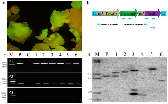 Determination of transformed callus. (a) The GFP phenotype of the transformation-positive calli on the DR-46B Dark Reader transilluminator at 3 weeks after infection, the non-fluorescing parts due to the callus being untransformed; (b) The PCR monitoring area and probe location in T-DNA organization of pHZM1-Rsc. Specific primer sites frame the T-DNA. P1 detected the selection marker egfp, P2 detected the regulator gene (Rsc), and P3 was used to detect the RS after the markers were eliminated. Probe 1 is on the gene Rsc, beside the restriction of endonuclease site Asc I, which is used as a marker for the southern blotting probe. (c) PCR analysis of the transformed maize calli. DNA was extracted from six independent transgenic GFP+ maize calli; specific primer pairs P1, P2, and P3 were used to detect the selection marker gene egfp, the regulator gene (Rsc), and the RS, respectively. M, BM2000 DNA marker; P, positive control P was used as the plasmid DNA; C, negative control; lanes no. 1–6, DNA from independent transgenic calli. (d) Southern blot analysis of the transferred gene in independent transgenic experiments. M, HindIII DNA Marker; P, positive control P was used as the plasmid DNA; lanes no 1–6, DNA from independent transgenic calli.