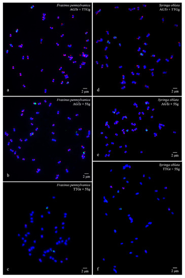 Visualization of mitotic metaphase chromosomes of Fraxinus pennsylvanica (a–c) and Syringa oblata (d–f) after fluorescence in situ hybridization (FISH). The first probe of (AGGGTTT)3 was labelled with 6-carboxytetramethylrhodamine (TAMRA) (red) in (a), (b), (d), and (e) (abbreviation AGTr); the second probe of 5S rDNA was labelled with 6-carboxyfluorescein (FAM) (green) in (b), (c), (e), and (f) (abbreviation 5Sg); and the third probe of (TTG)6 was labelled with 6-FAM (green) in a and d (abbreviation TTGg) and with TAMRA (red) in (e) and (f) (abbreviation TTGr). The concentration of all the probes was 10 μM. All the chromosomes were counterstained with 4,6-diamidino-2-phenylindole (DAPI) (blue). Scale bar = 2 μm.