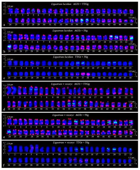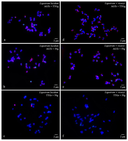 Visualization of mitotic metaphase chromosomes of Ligustrum lucidum (a–c) and Ligustrum × vicaryi (d–f) after fluorescence in situ hybridization (FISH). The first probe of (AGGGTTT)3 was labelled with TAMRA (red) in (a), (b), (d), and (e) (abbreviation AGTr); the second probe of 5S rDNA was labelled with 6-FAM (green) in (b), (c), (e), and (f) (abbreviation 5Sg); and the third probe of (TTG)6 was labelled with 6-FAM (green) in a and d (abbreviation TTGg) and with TAMRA (red) in (e) and (f) (abbreviation TTGr). The concentration of all the probes was 10 μM. All the chromosomes were counterstained with 4,6-diamidino-2-phenylindole (DAPI) (blue). Scale bar = 2 μm.