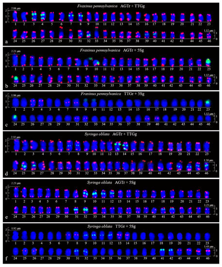 Repetitive DNA is the predominant component of heterochromatin and is typically associated with the centromeric, pericentromeric, subtelomeric and telomeric regions of chromosomes [28,29,30,31,32,33,34,35,36]. The telomere repeats (CCCTAAA)n, (TTTAGGG)n, (TTAGG)n, and (AGGGTTT)n, which are found in most angiosperms, have been localized to the ends of the gymnosperm chromosome. Picea abies (L.) Karsten and Larix decidua Mill. exhibit only terminal sites, but hybridization at centromeric sites has also been observed in Pinus sylvestris L. [37,38] and several intercalary sites in Pinus elliottii Engelm. [39]. The presence of interstitial telomeric signals on chromosomes has been correlated with chromosome rearrangements; as a result, these have been used as markers of chromosome evolution and could therefore be used to compare the phylogenetic relationship of species and even populations [40,41]. Trinucleotide (TTG)6 is most often repeated in the 4D-genome chromosomes of Avena species [42] and is also located in the pericentromeric and, occasionally, telomeric chromosome regions but exhibits low matching to the C genome of the Avena species [43]. This (TTG)6 probe has also shown signals at the pericentromeric chromosome regions of Hippophae rhamnoides L. (unpublished work). The ribosomal DNA (rDNA), such as 5S rDNA, have been physically mapped to the chromosome of plant species [44,45] and are useful for understanding the general patterns of chromosome evolution among related species and for cytotaxonomic approaches [46,47,48]. The physical chromosome maps for the Oleaceae genera Fraxinus, Syringa, and Ligustrum remain unknown because no repetitive sequence-based FISH studies have yet been performed.