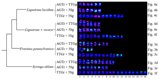 Because the (AGGGTTT)3 signals showed little difference among the chromosomes and the (TTG)6 signals and 5S rDNA signals discerned several chromosomes, as demonstrated in Figure 3 and Figure 4, chromosomes bearing (TTG)6 and 5S rDNA signals were arrayed together in Figure 5. The signal pattern obtained from the probe combinations (AGTr + TTGg, AGTr + 5Sg, and TTGr + 5Sg) showed similarity (major similarity in number and location and minor similarity in intensity) between L. lucidum and L. × vicaryi, and the two Ligustrum species shared central (TTG)6 signals from four chromosomes, subterminal 5S signals from two chromosomes and central 5S rDNA signals from four chromosomes, indicating a close relationship. (TTG)6 signals from F. pennsylvanica chromosomes were obtained from two additional signal sites, but two fewer 5S rDNA signals were obtained from the chromosomes of this species; thus, the total number of signals from F. pennsylvanica was equal to that from the two Ligustrum species, indicating a relatively close relationship. Compared with the signal numbers from Ligustrum species, four more (TTG)6 signals were obtained from the S. oblata chromosomes, and two more 5S rDNA signals were obtained from these chromosomes, indicating a relatively distant relationship. The variations in the 5S rDNA and (TTG)6 distribution can be ordered as L. lucidum < L. × vicaryi < F. pennsylvanica < S. oblata. Variations have observed in the three Oleaceae genera.