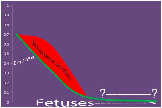 At least 10% of human pregnancies are supposed to be affected by aneuploidy [15,17]. The early human prenatal development is hallmarked by chromosomal mosaicism and CIN. Actually, about 70% (or even 90%) of embryos are suggested to be mosaic or to be affected by CIN [18,19,20]. Here, it is important to indicate that single-cell pathologic events leading to SCM/CIN in early embryos are likely to be more detectable as to other embryonic/fetal and extraembrionic samples, inasmuch as the cellular populations are small. Nonetheless, the early human prenatal development seems to be associated with increased somatic mutation rates [21]. Further stages of prenatal development are characterized by a decrease in proportion of embryos affected by SCM/CIN and/or non-mosaic chromosomal abnormalities, which seems to correlate with the formation of primary germ layers [16,22,23]. Simultaneously, developmental tissue-specific mosaicism and CIN occur. Thus, embryonic/fetal tissues (fetal brain) exhibit CIN manifesting as aneuploidy in 30–35% of cells. Additionally, nearly one-quarter of fetuses demonstrate brain-specific SCM [24,25]. Alternatively, mosaicism confined to placenta is observed in a small but significant proportion of pregnancies (0.5–1%) [26,27]. The impact of numerical chromosome abnormalities on cellular/fetal homeostasis lies at the origins of an appreciable proportion of spontaneous abortions (fetal deaths). In the light of SCM, up to 25% of spontaneously aborted fetuses are chromosomally mosaic [28,29,30]. Although the intrinsic effect of CIN on fetal homeostasis remains to be assessed, the impact of low-level mosaicism on fetal/embryonic viability seems to be elusive [31,32]. During prenatal diagnosis, the incidence of SMC still remains appreciable [33,34]. However, since systematic evaluations of SMC/CIN in prenatal diagnosis have been generally made using karyotyping, the real incidence is hardly evaluable. In this context, one should bear in mind that cytogenetic (molecular cytogenetic) prenatal diagnosis is usually performed in pregnancies with an increased risk of chromosomal abnormalities [33]. In newborns, low-level SCM may be detected in almost all individuals [3,35]. This phenomenon is likely to be a trace of a decrease in rates of SCM/CIN due to natural cellular selection [3,7,12,25]. Alternatively, due to the devastative effect on cellular homeostasis, SCM/CIN might result in mosaic chromosomal pathology with recognized patterns of malformations after birth [14,36]. The latter is relatively uncommon in newborns studied by karyotyping [37,38]. However, the application of single-cell molecular cytogenetic techniques gives an impression that SCM and CIN rates are significantly higher than the rates revealed by cytogenetic analyses [16,35,39]. Unfortunately, SCM and CIN are poorly studied by molecular cytogenetic techniques in unselected population at perinatal period. However, a trend of a decrease in the rate of interindividual genetic variation during prenatal development due to natural selection appears to exist. Figure 1 depicts this trend with an attempt to highlight spontaneously aborted fetuses with SCM as the most probable cause for the decrease.