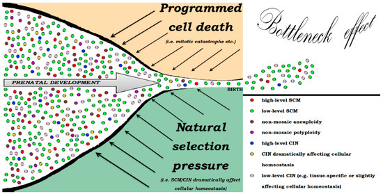 Paradoxically, SCM and CIN may serve either or both as a mechanism for regulation of cell numbers and as a cause for prenatal mortality (postnatal morbidity). The former is likely to be an integrated part of human development, whereas the latter is likely to the result of alterations to the former. It appears that SMC and CIN are elements of a global developmental system targeted at endogenous cellular selection through programmed cell death (i.e., mitotic catastrophe) in addition to the natural selection pressure achieved through dramatic impact of mosacism and genomic instability on cellular/fetal homeostasis [12,16,47,48,49,50]. Accordingly, we propose a bottleneck model for the description of SCM and CIN effects on human prenatal development (Figure 2). The bottleneck effect might be a mechanism for the ontogenetic changes in the rates of SCM and CIN.