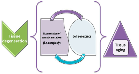Hypothetical role of SCM/CIN in aging. It appears that accumulation of somatic mutations (e.g., aneuploidy, alterations to chromosome structure, repeat length variations, intragenic sequence changes, etc.) interplays with cell senescence. The result of this interplay might produce either aging at the tissular level or tissue degeneration, which is likely to be responsible for aging of an organism, as a whole.