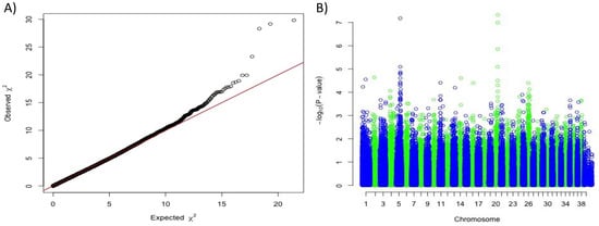 Genome-wide association study results based on 34 white dogs (White Shepherds, Poodles, Cottons de Tulear and Bichons) versus 128 non-white dogs (German Shepherds and Poodles). (A) Quantile-Quantile plot displaying a genomic inflation λ of 1.000015, indicating no residual inflation. (B) Manhattan plot displaying the results from the GWAS. This analysis pointed out two loci on chromosome 5 (Chr5:63,666,161 pcorrected = 6.7 × 10−8) and on chromosome 20 (Chr20:55,213,866, pcorrected = 4.7 × 10−8).