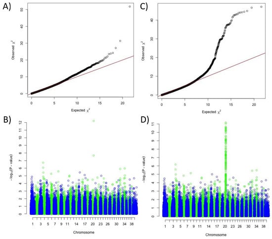 Results of the genome-wide association study for the phaeomelanin dilution phenotype, using 138 cases (dogs with diluted phaeomelanin) and 2325 controls (dogs with undiluted phaeomelanin). (A) Quantile-Quantile plot of GWAS displaying a genomic inflation λ of 1.000039. (B) Manhattan plot displaying the results from the GWAS: two significant SNVs on chromosome 20 (chr20:55,850,145, praw = 5.5 × 10−289, pcorrected = 6.01 × 10−13 and chr20:55,213,866, praw = 1.26 × 10−175, pcorrected = 2.16 × 10−8). (C) Quantile-Quantile plot of GWAS with imputed SNVs from the candidate region of chromosome 20 displaying a genomic inflation λ of 1.000045. (D) Manhattan plot displaying the results from the GWAS with imputed SNVs from the candidate region of chromosome 20: a unique highly significant locus on chromosome 20 (two best SNVs Chr20:55,850,145, praw = 5.5 × 10−289, pcorrected = 6.82 × 10−12 and chr20: 55847284, praw = 15.08 × 10−286, pcorrected = 8.74 × 10−12), separated by 2 kb.