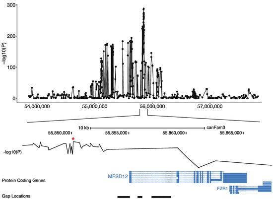 Screenshot of the locus on the canine chromosome 20 locus associated with the phaeomelanin dilution. The GWAS p-values of the 444 imputed variants on the 138 cases and 2325 controls are represented on the top. The best GWAS SNV (indicated by a *) located ~5 kb upstream of the MFSD12 gene is represented on the middle and the MFSD12 exon position, relatively to the gap position is illustrated on the bottom.