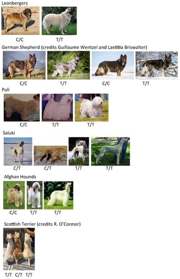 - Sponenberg, D.P.; Rothschild, M.F. Genetics of coat colour and hair texture. In Genetics of the Dog; Ruvinsky, A., Sampson, J., Eds.; CABI Press: New York, NY, USA, 2001. [Google Scholar]