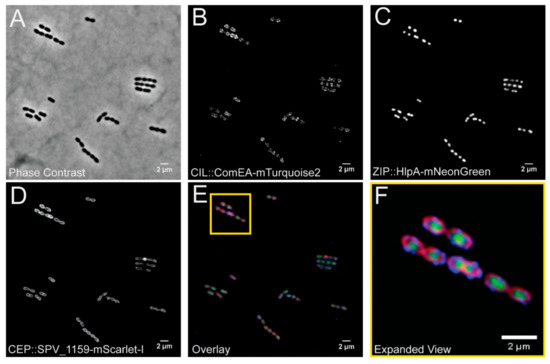 Visualization of a pneumococcal strain VL2706 expressing three different fluorescent fusions simultaneously from the three different integration loci. From the CEP locus (PEPX): ComEA-mTurquoise2; from the CIL locus (PEPY): SPV_1159-mScarlet-I; and from the ZIP locus (PEPZ): HlpA-mNeonGreen. Integration of the three constructed vectors produced distinct localizations based on the proteins used for the fusion. (A) A phase contrast image of VL2706. (B) The ComEA-mTurquoise2 fusion produced strong foci around midcell as well as at the poles of the cell as previously shown [31], (C) HlpA fusions produce distinct green signal that localizes at the chromosome [32,33], and (D) SPV_1159 fusions produce distinct membrane associated signals in the bacterial cells. (E) An overlay of the three simultaneously expressed fusion proteins and a yellow outline of (F) containing an expanded view of the image.