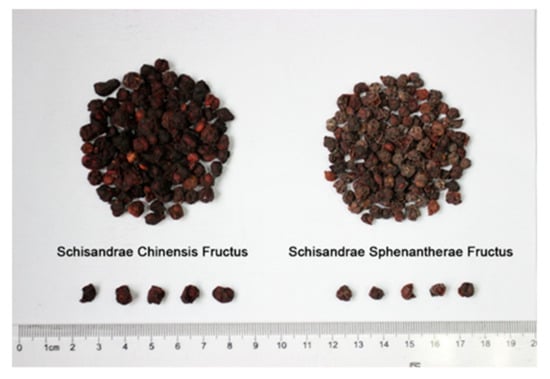 Schisandra of the family Magnoliaceae is a genus with about 30 species, two of which, namely Schisandra chinensis (Turcz.) Baill. and Schisandra sphenanthera Rehd.et Wils., have a long history of clinical use in China. Schisandrae Chinensis Fructus, the dry ripe fruits of S. chinensis, is recorded as Wuweizi in Chinese pharmacopeia. It has functions of astringing and securing, tonifying qi and engendering fluid, as well as tonifying the kidney and calming the heart [1]. As a well-known traditional Chinese medicine, it has been used for thousands of years because of its outstanding physiological as well as therapeutic effects [2]. It has also been recognized as an official medicine in the Russian Pharmacopoeia since the early 1960s [3]. Modern pharmacological research demonstrates that the fruits of S. chinensis contain various active components, which act as hepatoprotective [4,5], antioxidative [6], anti-inflammatory [7,8], and anti-cancer agents [9,10]. Schisandrae Sphenantherae Fructus, the dry ripe fruits of S. sphenanthera, is listed in Chinese pharmacopeia as Nanwuweizi, but has been used as Wuweizi for a long time. Nanwuweizi is inferior to Wuweizi according to the ancient pharmaceutical book Shen Nong Ben Tsao Ching and this fact has been confirmed by several clinical studies [2,11]. Nanwuweizi was listed as a new entry in Chinese pharmacopeia in 2010 because its active components, medicinal values, and qualities are different from Wuweizi [12]. However, Wuweizi is often adulterated by Nanwuweizi in the herbal market because of their similar fruit morphologies (Figure 1) and the lower price of Nanwuweizi. To guarantee their safety and efficacy, the correct identification of Wuweizi and its Chinese patent medicines is highly desired.