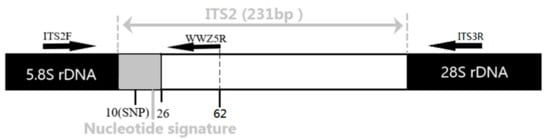 Schematic diagram showing the location of primer pairs (ITS2F/WWZ5R, ITS2F/ITS3R) and the nucleotide signature region of S. chinensis.