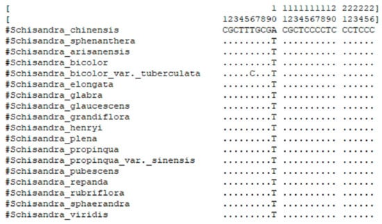 For the evaluation of the uniqueness and specificity of the 26-bp nucleotide signature, the 18 haplotypes of the 143 ITS2 sequences representing 18 Schisandra species were aligned using MEGA 7 (Figure 3) [35]. The result of the alignment confirmed the presence of one or two divergent nucleotides within the 26-bp special nucleotide signature between S. chinensis and other Schisandra species. In addition, the BLAST was conducted on GenBank using the 26-bp special nucleotide signature of S. chinensis as the query sequence. The results showed that the identification score of S. chinensis is 100%, while for other species, even for closely related species, the identification score was less than 100% (Table 3). Therefore, the 26-bp nucleotide signature, newly developed in the present study, can serve as a unique tool for distinguishing S. chinensis from the other species presented in GenBank.