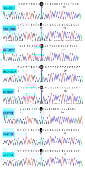 Raw ITS2 trace files generated from our study were assembled using CodonCode Aligner V.8.01 (CodonCode Co., Dedham, MA, USA). All the ITS2 sequences of Schisandra species, also including those downloaded from GenBank, were annotated as well as trimmed through a hidden Markov Model-based method to obtain the complete ITS2 regions [34]. The haplotypes of Schisandra species were selected by CodonCode Aligner and then aligned with MEGA 7.0 software [35]. The unique region was finally verified by BLAST analysis.